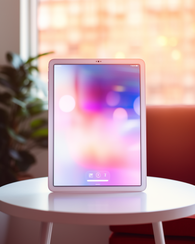 a medium shot photograph of an LED large ipad (vertical) floating mid-air in a (blurry background; gradiant background). the ipad is perfectly designed with rounded edges in apple style. the image has excellent indoor lighting, from partial sunlight overhead. clean space, abstract vibe. --ar 4:5