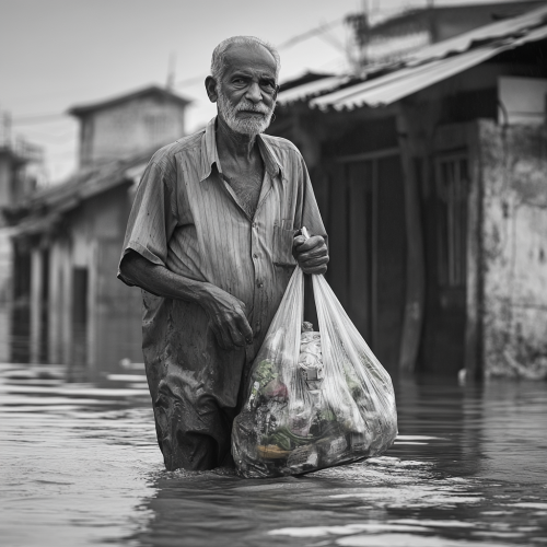 bangadeshi old muslim man, flot in a flooded water and carrying a grocery bag with oil vegetables and rice, a house half in under flood water, black and white color tone,
