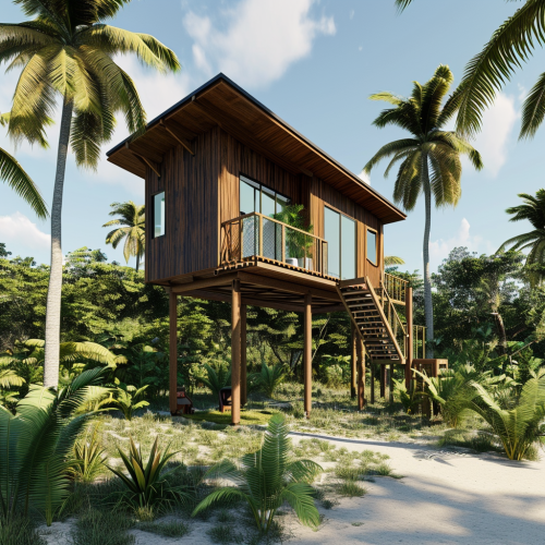 a beach house plan, 6*4 meter, 5m height, elevated from the ground 1 m. --s 50 --v 6.0 --style raw