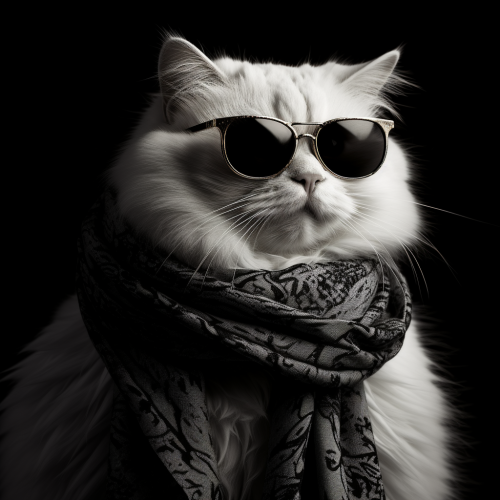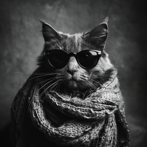 Subject: Cat wearing sunglasses. Elegant and stylish, wearing a scarf. Genre: Photography, studio portrait in the style on Annie Leibovitz. Color: black and white. Format: Digital. Lens size: 50mm. Composition: Portrait. Lighting: Artificial. Environment: Interior. --v 6.0