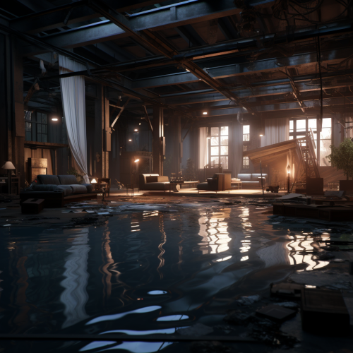 inside of a large flooded soundstage movie studio, exterior of house inside, artificial lighting, rendered in unreal engine
