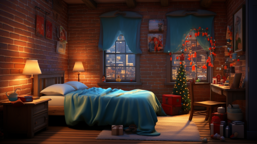 A cozy bedroom, A minimalist cartoon , simple line art, simple background, bed with a neutral color palette, christmas decorations, gentle lighting, hd quality, night time, Disney style bedding --ar 16:9 --v 6.0