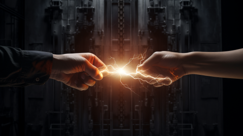 two hands transferring electric charges from finger to finger in an industrial dimly lit backdrop --ar 16:9 --s 50