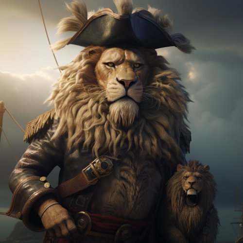 a magnificent lion standing tall. Defeated pirate on the ground. , 4k, ultra hd, shot with canon r5 50 mm 1.2 --style raw