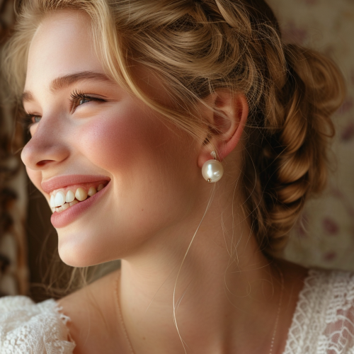 jewelry model, closeup face portrait. a happy laughter, young blonde woman, hair in a french braid. Showcasing a large pearl stud earring. Sharp focus. --v 6.0