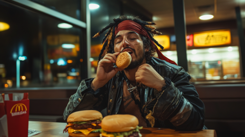 A realistic photograph of a man in a simple makeshift pirate halloween costume, looking very tired but content with eyes closed, sitting at a table inside a Burger King in the middle of the night. He is happily biting a burger, surrounded by the fast-food decor. The lighting is cold and inviting, capturing the late-night vibe. He looks very messy and very sweaty after a long night of heavy partying. --style raw --ar 16:9