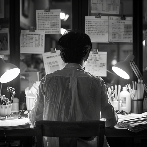 Young Korean man studying at desk late at night, surrounded by research papers and books, viewed from behind, cinematic black and white, desk lamp lighting, documentary style, determined mood, film grain, ultra detailed --ar 1:1 --v 6.0 --s 250