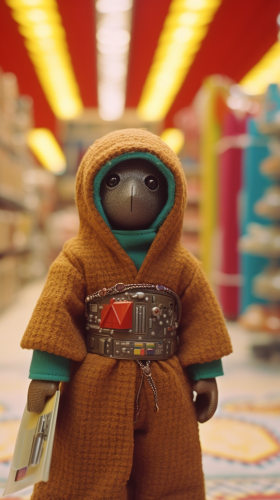 jawa wearing Gucci in a toy store, 1970s style, shot on Hasselblad, natural lighting, --ar 9:16 --v 5.1 --style raw --s 750