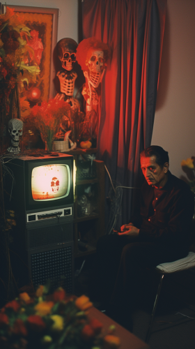 latin dad fixing a vcr tv in his house, in "DÃa de muertos", Disposable camera --ar 9:16