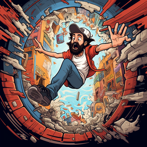 a cartoon of a bearded man wearing a snapback and streetwear falling through a portal backwards to Mexico City in comic style