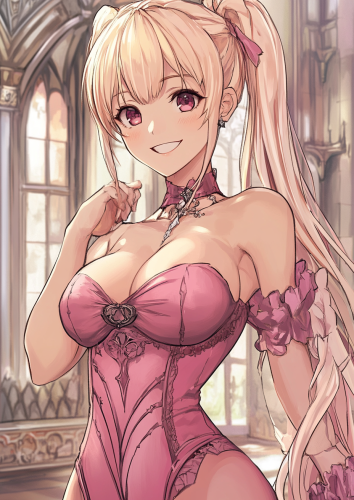 medieval, kawaiipunk, kitty, pink, blonde hair, strong jawline. hour glass, slim waist, Symmetry, proportion, fitness, curves, height, clear skin, and balanced features, smiling sinister proud happy expression by tsutomu nihei --ar 500:707 --v 6.1