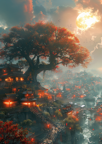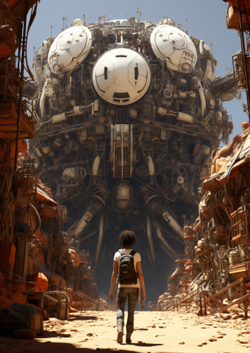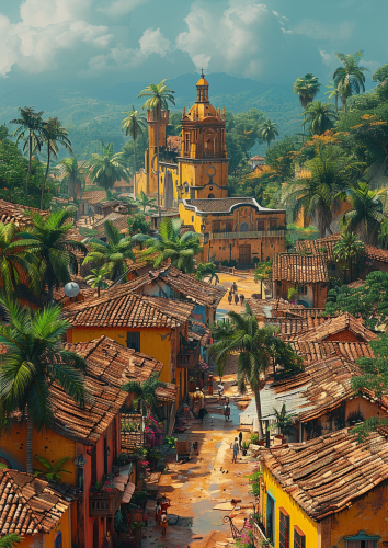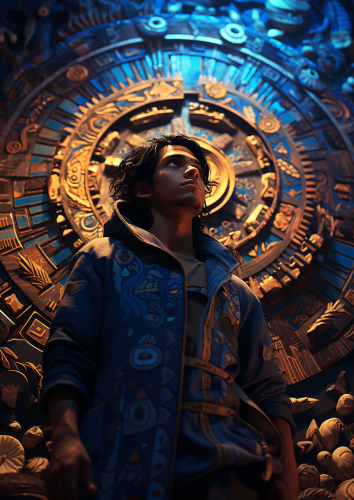 A scintillating Latino Traditional art epic cinematic scene image with Biomechanical Wonders, a latino art style, and a Overhead view --v 6.0 --c 15 --ar 5:7 --s 750