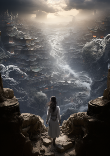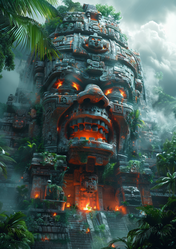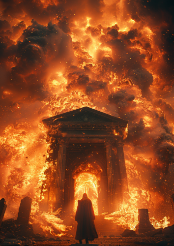 Under the weather, patience. Latino Vorpal epic cinematic scene image with Mausoleum, Self-Detonation, Hell, a latino art style, and a Zooming view --v 6.0 --c 15 --ar 5:7 --s 750