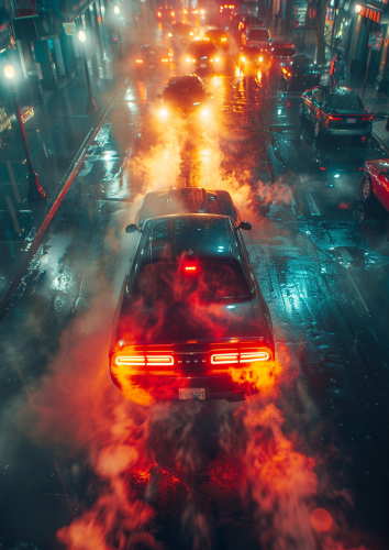 A pristine Latino Vehicle modeling epic cinematic scene image with Pixelation in photography, Spellbook, Dodge Demon, a latino art style, and a Slow-motion view --v 6.0 --c 15 --ar 5:7 --s 750