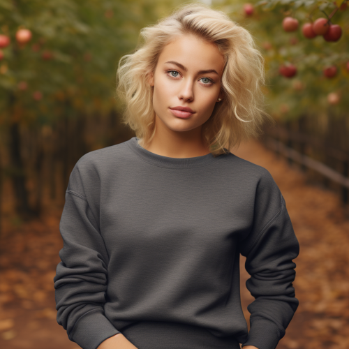 mockup for etsy woman with a high blond ponytail wearing a dark graphite heather grey crewneck Gildan 18000 sweatshirt, crewneck sweathshirt in the style of an Urban Outfitter advertisement, spiritualcore, cabincore, in an apple orchard, pleasant and happy, film grain added in post production