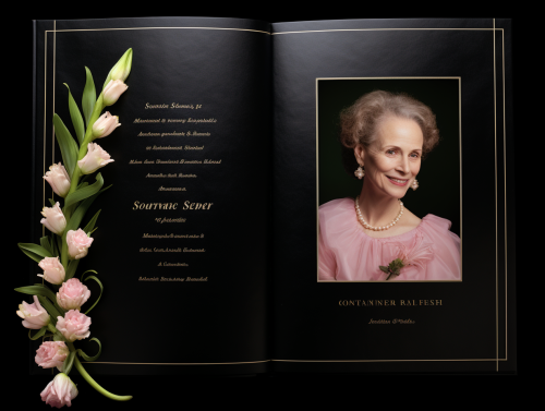 A very extremely formal, funeral program on darkest deepest pigmented Black colored heavy gloss paper with brilliant, brightest heavy golden Victorian calligraphy fonts written in Italian language, with a front photograph of a strikingly beautiful bouquet of shimmering Pink colored Globe Amaranth flowers surrounded by deeply colored green leaves, the photograph has a dark black background or dark black drapery background, minimalistic, very dramatic lighting, studio lighting, vibrant color, detailed, intricate design, upscale design, extremely upper class design, --ar 4:3 --v 5.2 --s 75 --c 23