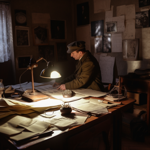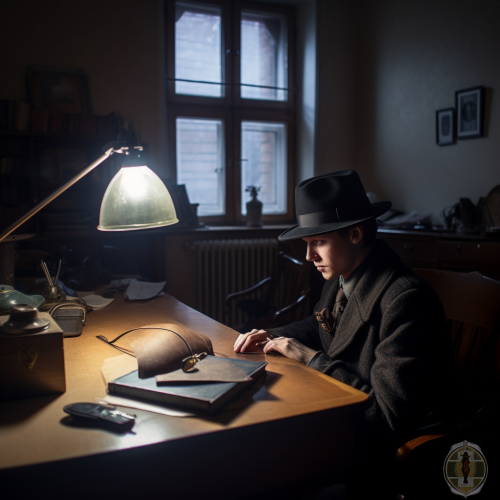 clear focused colour photo looking to investigator sitting by the table in dark investigator room of Latvian security forces in year 1930, detailed, chaos, wooden table, books, photos on wall, lamp, --upbeta --v 5.0