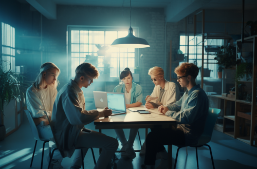 in a bright lit abstract space, a group of six young cool office workers dressed casually are surrounding a sitting man at his table, laughing facing his laptop , bright light , bluish tones and sunlight, photorealistic, in the style of fujifilm pro 400h, viennese actionism, sony fe 85mm f/1.4 gm, Unreal Engine 5, Cinematic, Color Grading, Photography, Photoshoot, Shutter Speed 1/1000, F/22, White Balance, 32k, Super-Resolution, Megapixel, ProPhoto RGB, VR, Large, Epic, Artgerm, Half Backlight, Backlight, Daylight, incredibly detailed and complex, hypermaximalistic, elegant, hyper realistic, super detailed, c 15 --s 500 --ar 80:53 --v 5.0