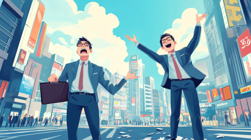 "Create a Disney Pixar-style illustration featuring two salarymen in a city setting. On one side, depict a salaryman with a sad expression, tears in his eyes, dressed in a slightly disheveled suit, holding a briefcase that has spilled papers. On the opposite side, illustrate another salaryman who is joyfully celebrating, with a big smile, arms raised in triumph, dressed in a sharp suit with a tie. Capture the contrast between their emotions, with whimsical details like animated clouds overhead, playful expressions, and a colorful urban background that reflects the vibrant life of the city. The scene should convey the ups and downs of office life, showcasing both sorrow and joy in a charming and heartwarming manner.