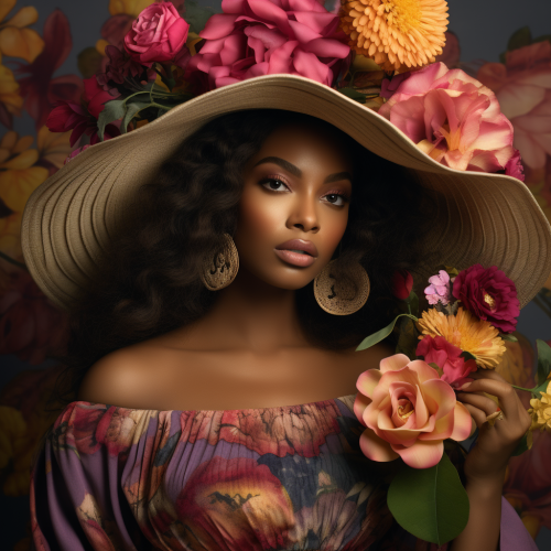 ??♀️?????beautiful brown woman wearing a dress and a hat, colorful flowers --v 5.2