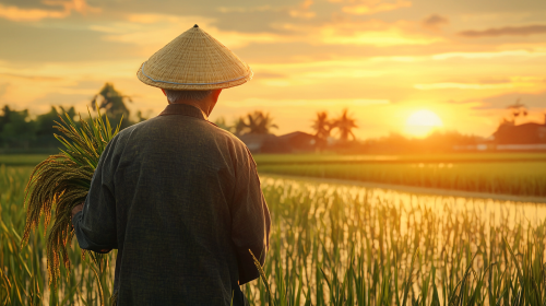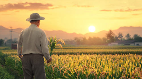 Yuan Longping, Chinese man, rural China, advanced and clean environment, back view, scientist, kind and approachable, elderly man, rice field, experimental paddy, holding rice plants, sunset, realistic, extremely realistic, hyper-realistic, hunched, thin, short, no hat, D810, exquisite, exquisite brushwork, Photorealistic, --v 6.1 --ar 16:9 --quality 2 --style raw