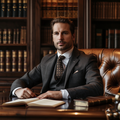 make an image of an european male lawyer that is sitting at a wooden desk in her lawyer office. he is wearing a suit. he has brown hair. he is 30 years old --ar 1:1 --v 6.0