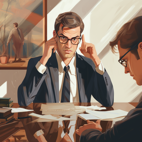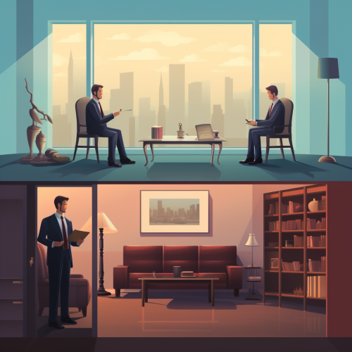 a split image, where one side is a lawyer talking to their client, and on the other side is the client talking to the lawyer. flat art