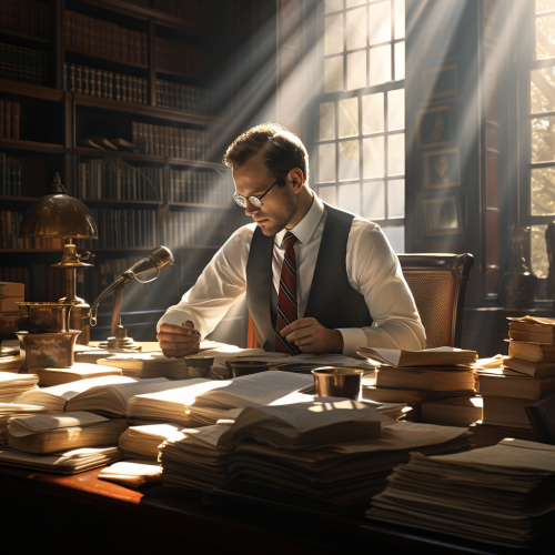 lawyer in taking a sip from his coffee at his desk full of papers and lawbooks in an old office with bookcases that is lit by the sunlight through the window, realistic, portrait