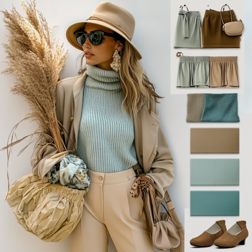 make a womens fashion mood board for a golf clothing brand. Use blues, tans, light greens. The collect is for autum. Do not use autum themes. Use fashion themes. Use fashion images. Use a color palette inspiration image