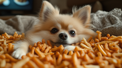 white fur Pomeranian, about 7 years old. Laying on his back, fat stomach showing. McDonald's fries scattered all over the room. Many empty fry containers laying about, his eyes lazily half-closed, surrounded by a mess, living room setting with a cozy couch and TV in the background, soft lighting, messy yet oddly adorable, relaxed and carefree atmosphere, Photography, captured with a Canon EOS R5 using a 50mm f/1.2 lens, fine details, hyper maximalist, 3D rendering, C4D, depth of field, high-definition photography, natural lighting, full HD 8K --ar 16:9 --stylize 750 --v 6.1 --chaos 7 --weird 2