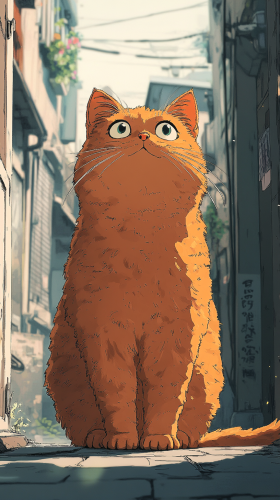 Japanese animation has a lazy style with consistent colors and comfort. The background is semi-milky white and light gray. A fat orange cat stands and dresses up the city tempura --ar 9:16 --style raw --stylize 300
