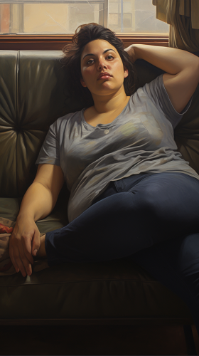 really fat hispanic woman, looking lazy and unmotivated, slouching on couch, detailed, realistic --ar 9:16
