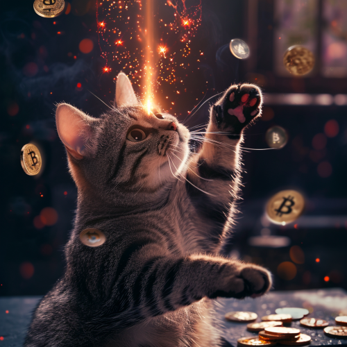 A cat summoning life with its paws and Bitcoin in the background --v 6.0