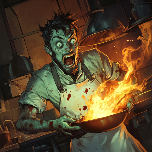 a skinny chef with a beer belly. The chef has green skin. The chef has two tusks sticking out behind his bottom lip. The chef has black and grey stubble. The chef is panicking. The chef looks scared. The chef does not look angry. The chef looks funny. The chef does not look scary. The chef is holding a pan. The pan is on fire. The chef is stood in a kitchen. Anime style --v 6.1