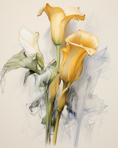 Bell-shaped flower, blooms, vegetation plants, leafs, bouquet, illustration, sketch drawing, hand made drawing in style of Toulouse-Lautrec, zin lim, leonardo davinci drawing with charcoal sticks, chalk pastel, color pencil, blur shadows, smooth lines, soft drawing, blended charcoal, blur the stain from the drawing, on background white --c 10 --ar 4:5