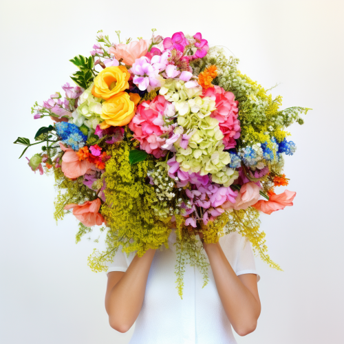 celebrity with bouquet of flowers on the head, the bouquet is so big that it hide their eyes, white background, impressionism style, super resolution, white background, 12k, ultra hd, best image quality: :: --stylize 0 --chaos 0 --weird 0