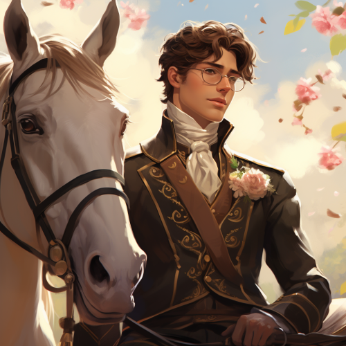 Prince Charming on a horse handsome young prince painterly anime style, round glasses outfit with gold accents, shy, cute, romantic brown hair, humble and sweet, flowers