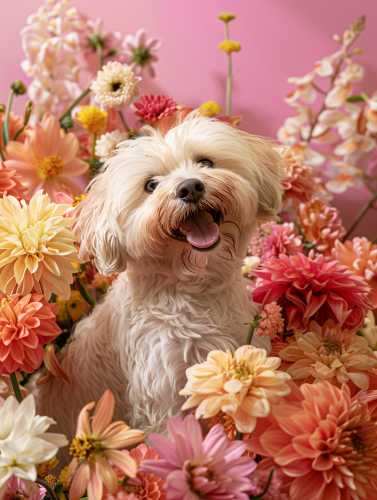 a bouquet of chrysanthemums, lilys, orchids, dahlias, and alyssums, with a cute pup smiling behind bouquet, soft pink background, shot on leica SL camera --ar 3:4 --v 6.0