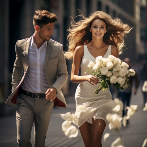 Empowered Woman very well dressed in high heels running on the street away from the guy behind her, the guy holds in his hand a flower buquet, urban clean scenery, 8k quality, full hd, high quality body details, ultra perfect, perfect body detailed, freckles, Cinematic lighting, , Cinematic, Color Grading, Editorial Photography, white background, high resolution, fluid freeform organic shapes, clearly defined colors, backlight, frontlight, soft lighting, 3D effects, 32K, 8 ar16:15--v5.2