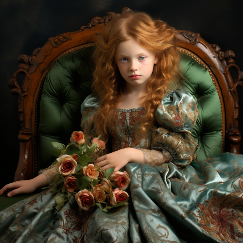 7 year old red hair Irish girl dressed in lavish princess gown posed full length on an antique simple chaise lounge with a bouquet of bold colorful flowers in hand, flowers resting on chaise. ultra photorealistic. Full gown, tiara crown on head, necklace, rings and bracelets. Irish tartan fabric draped on arm of chaise. simple old master photography studio backdrop. lit in the style of annie leibovitz. --v 5.2