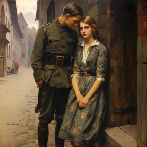 old german painting 1900. a Polish town. a beautiful Polish, young woman. a german soldier stand next to her, the woman is shy. both are happy