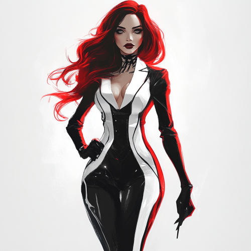 full body. beautiful female with glowing scintillating skin and hair wearing an expensive black and white suit dress. white background. style of charlie bowater, laurie greasley and james jean, red hues, charlie bowater art style, beautiful comic art