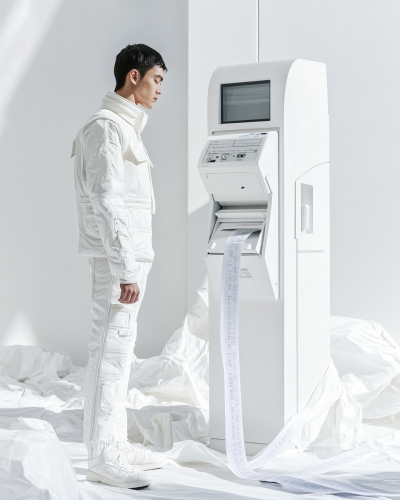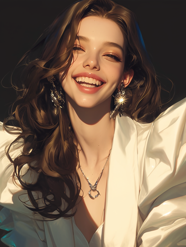 a laughing girl ,in a White suit, in the style of pop inspo, new york school, hallyu, white and black, piles/stacks, shiny/glossy, neoclassical --ar 3:4 --s 400 --niji 6