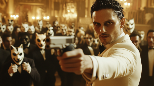 ake gylenhaal in a white suit, points the barrel of a gun against the temple of his head with a blank expression. he is in a warmly lit ballroom surrounding by hundreds of suited people wearing animal masks, they are are all looking at him, highly cinematic --ar 16:9