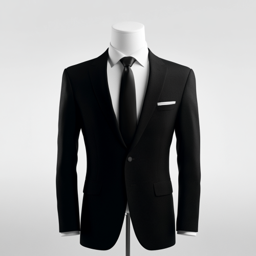 a mannequin standing in a studio like setting with white background wearing A formal suit which includes a well-tailored suit in classic black colour. The suit should fit the driver perfectly to give the impression of confidence to passengers. A white shirt underneath the suit always maintains a pristine appearance, the shirt should be always cleaned, steamed and free of wrinkles. A black tie must be worn on every single occasion, the tie must be steamed clean and well done. Black shoes like Oxford or derby shoes made of leather or similar should always be well maintained and good looking by being polished regularly. Professional photography, fashion photography, 4k quality, high end fashion, octane render, hyper realistic