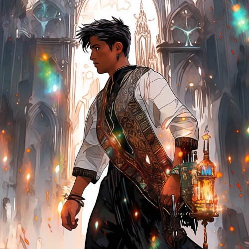 close-up, male filipino pinoy priest walking past a gothic hindu temple, holding a smoldering censer, inspired by kj apa tom daley adam rippon, colored inks style, style of luis royo, leonid afremov, mike zeck, edgard maxence, erin hanson --niji 5
