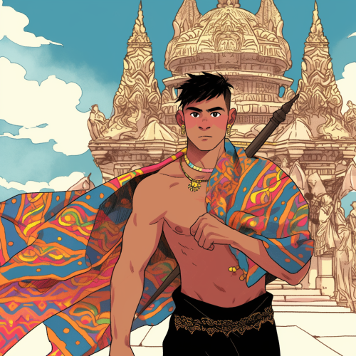 close-up, male filipino pinoy priest walking past a gothic hindu temple, holding a smoldering censer, inspired by kj apa tom daley adam rippon, colored inks style, style of luis royo, leonid afremov, mike zeck, edgard maxence, herb ritts --niji 5