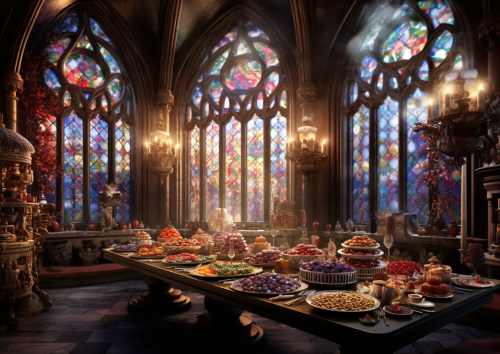surreal, A haloween winter feast in a medieval oriental castle. The architecture is rich and detailed. Sunlight streams through multicolored stained-glass windows. hyper-realistic highly detailed, --ar 14:10 --v 5.2 --c 5