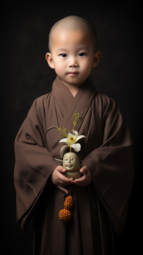 [8d7543297] The 3 or 5-year-old Japanese novice monk is dressed in a robe, holding prayer beads, and has taken a cute portrait photo --v 5.2 --ar 9:16 --c 0
