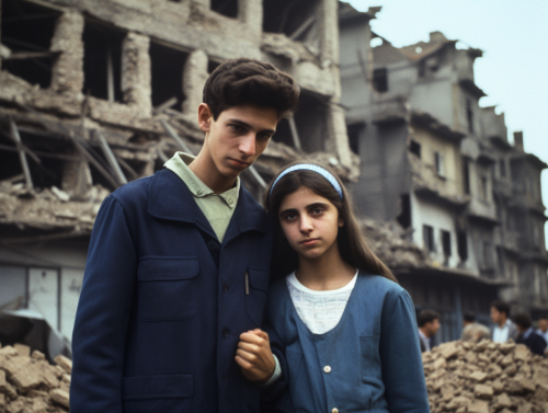a jewish boy and a muslim girl holds hand under collapsed buldings on the street, --ar 4:3 --v 5.0 --s 250